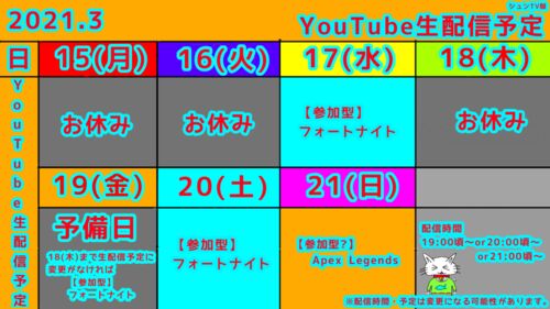 ニャーニャン!!どうもこんにちは!シュンTV駿の駿猫(シュネコ)です!✨3月第3週のYouTube生配信予定を出します!✨こんな感じになります!今週はフォートナイト週2・ApexLegends週1の予定になります。今週も予備日を作ってみました! 木曜日までに出来なかった配信…