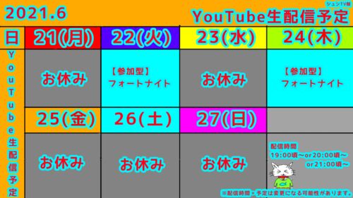ニャーニャン!!どうもこんにちは!シュンTV駿の駿猫(シュネコ)です!✨6月第4週のYouTube生配信予定を出します!✨こんな感じになります!今週はフォートナイト週2の予定になります。 (いつもの水曜日・金曜日の生配信を火曜日・木曜日に変更させて頂きます。)新生…