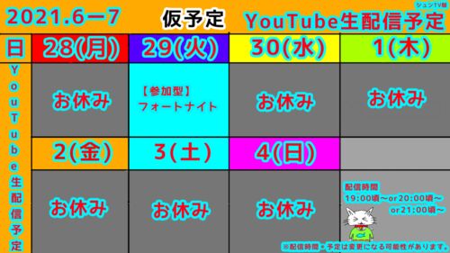 ニャーニャン!!どうもこんにちは!シュンTV駿の駿猫(シュネコ)です!✨6月第5週・7月第1週のYouTube生配信予定を出します!✨こんな感じになります!今週はフォートナイト週1の予定になります。 (一応、仮予定になります。 もしかしたら変更になる可能性があります…