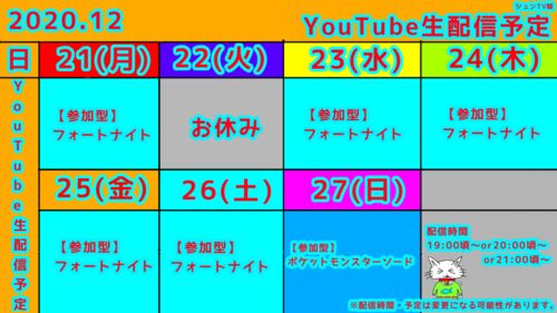 ニャーニャン!!どうもこんにちは!シュンTV駿の駿(シュン)です!✨12月第4週のYouTube生配信予定を出します!✨こんな感じになります!今週はフォートナイト週5・ポケットモンスターソード週1の予定です!✨(火曜日はいつも通りお休みします!)年末が近づいて来てます…
